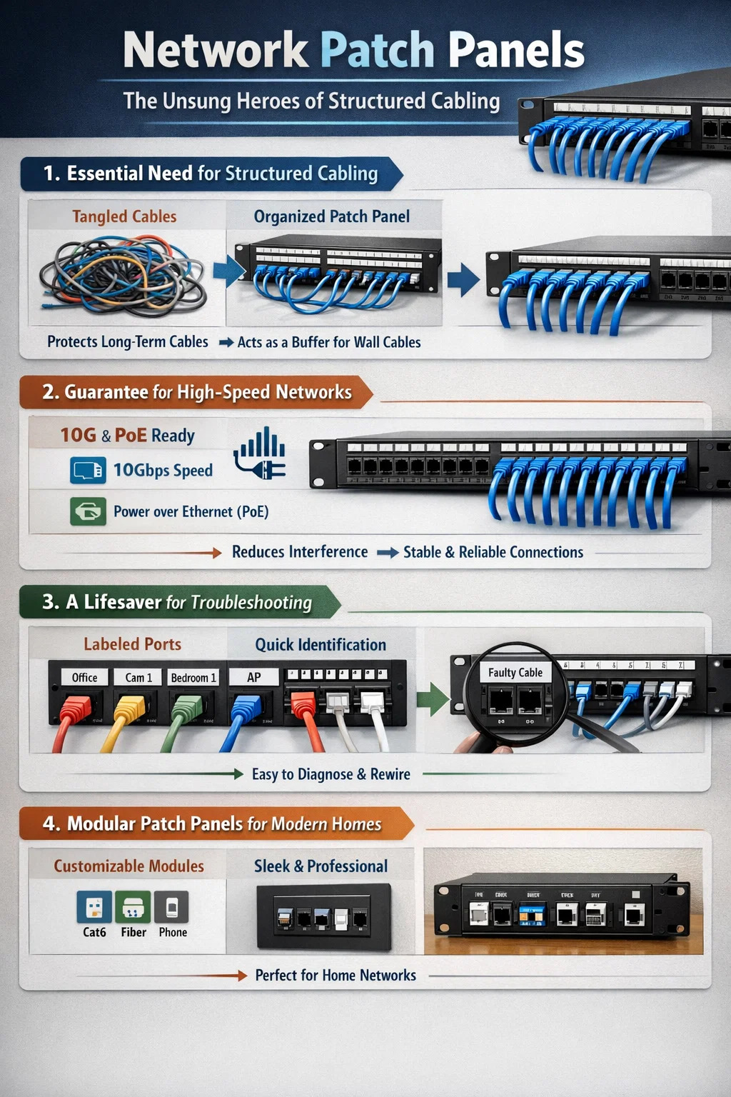 Physical layer protection: The network cables inside the walls are usually rigid. If they are plugged directly into a switch, frequent plugging and unplugging and movement can cause the wire cores to break. The patch panel acts as a buffer; it remains stationary, and you only move the short patch cables on the outside, protecting the expensive long cables inside the wall.
