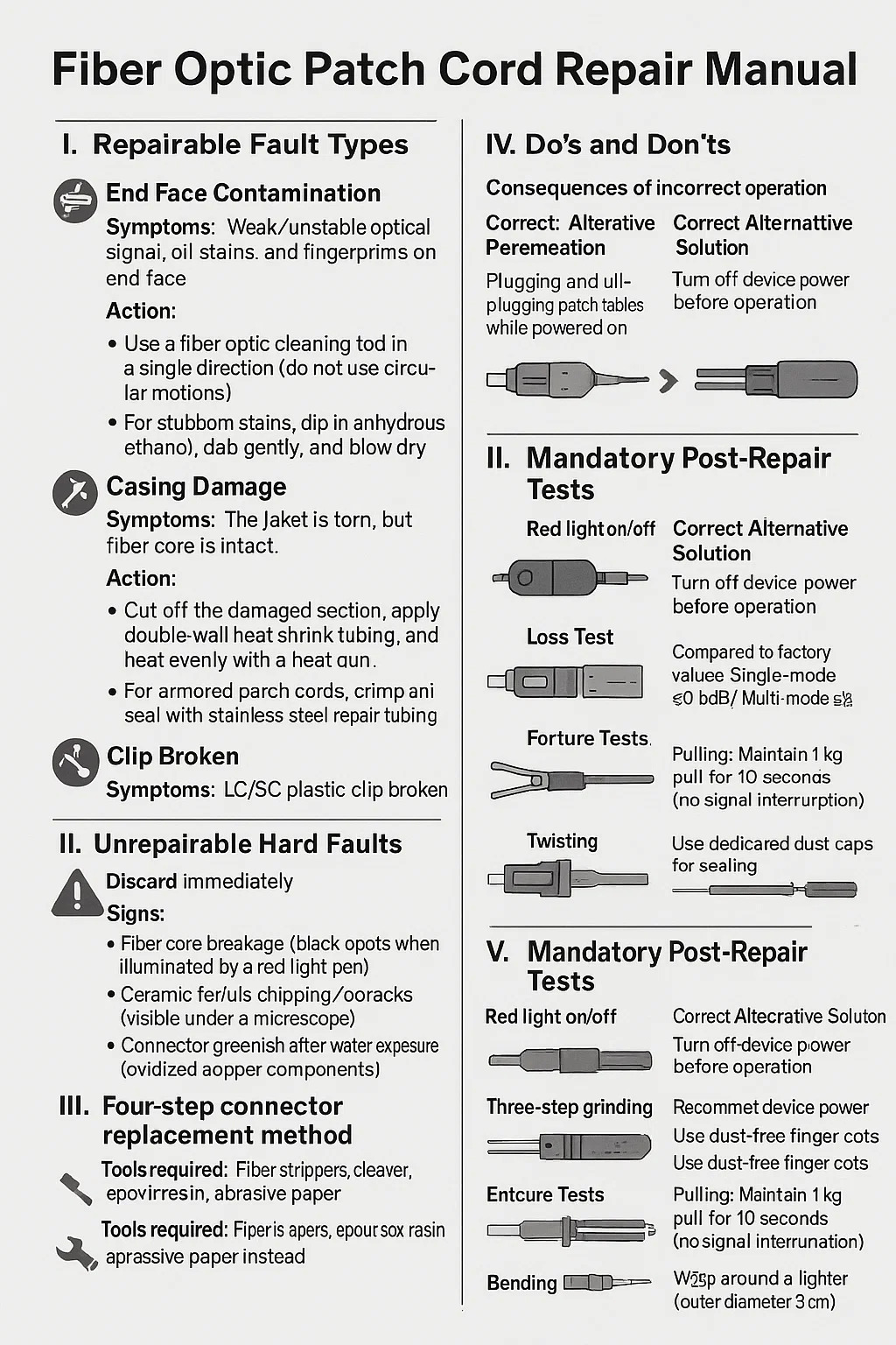 Fiber end removal: Cut off the damaged end, leaving at least 15cm of excess fiber. Strip off 3cm of outer jacket and clean the fiber core with an alcohol wipe. Thread a new connector. Insert the bare fiber into a new LC/SC ceramic sleeve. Inject blue epoxy resin and cure for 30 minutes. Precision cutting: Use a fiber cleaver to vertically remove the excess fiber core. The cross-section should protrude ≤0.5mm from the sleeve. End face polishing