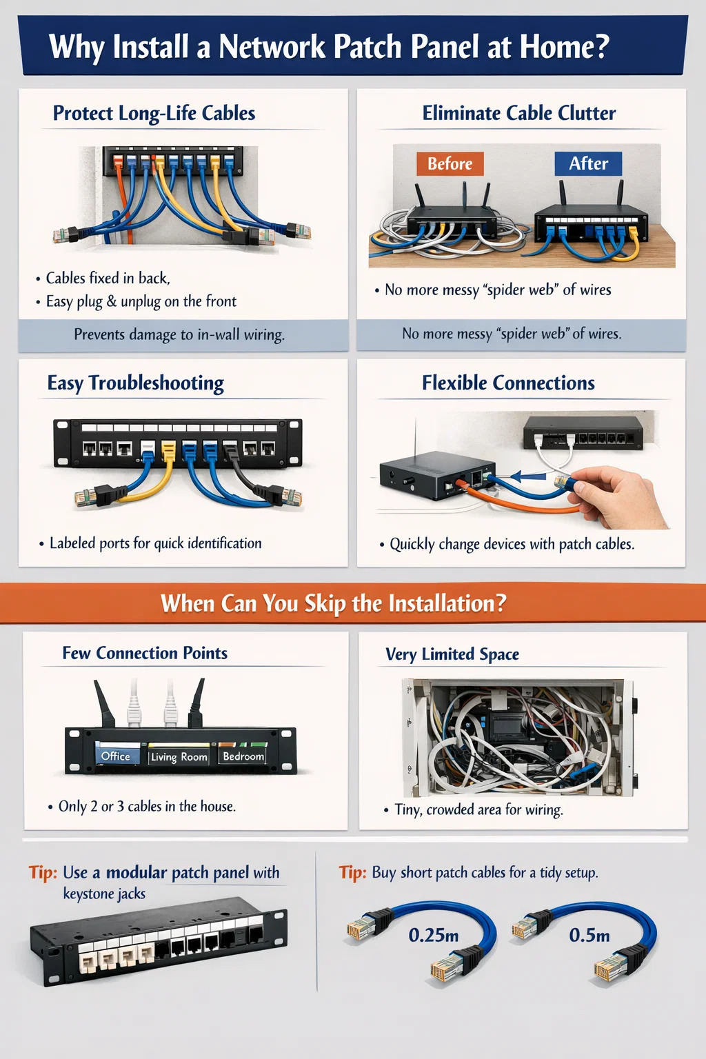 Once you've installed the patch panel, be sure to buy some ultra-short network cables (patch cables) of 0.25 meters or 0.5 meters to connect the patch panel to the switch/router for the neatest setup.