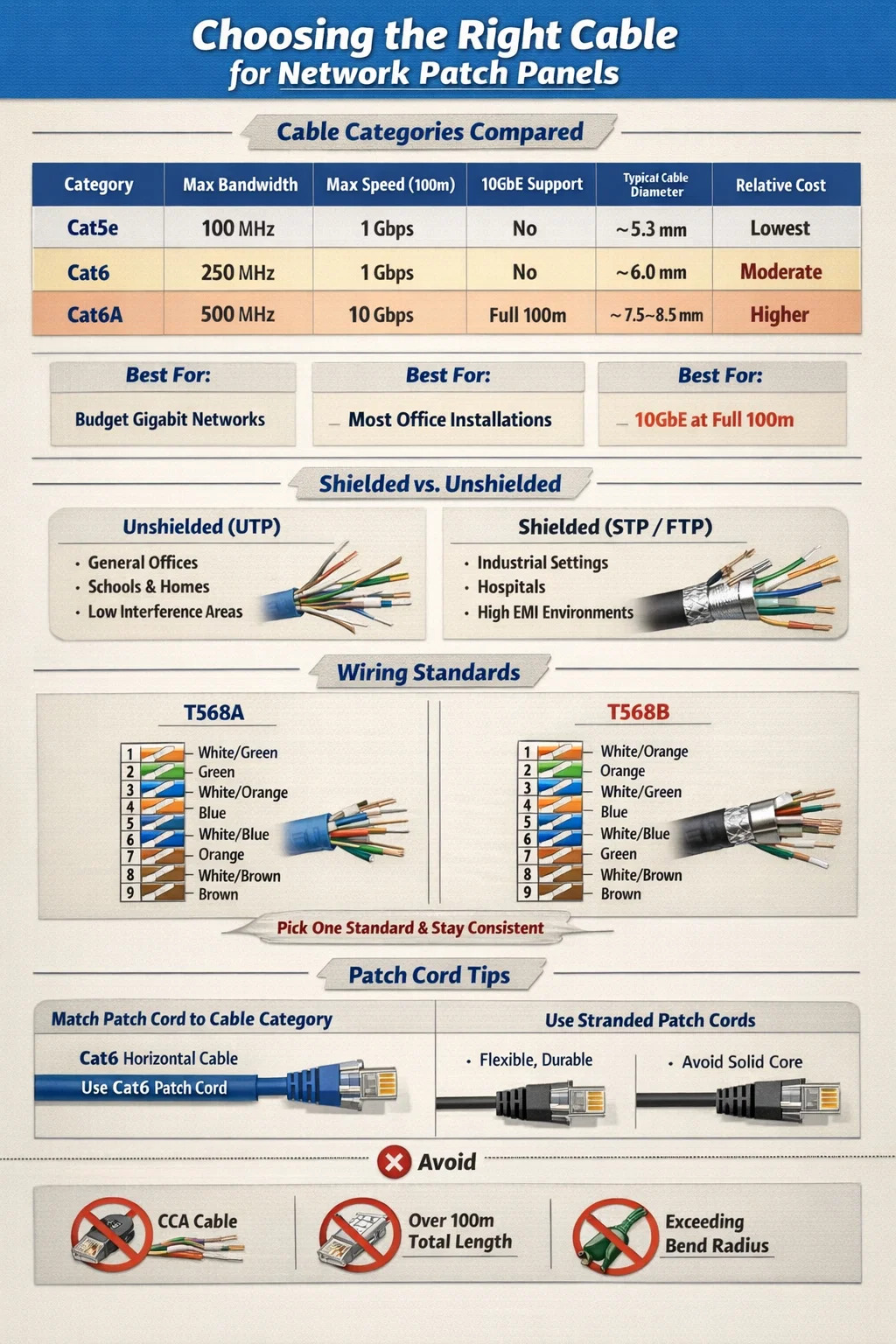 Most people focus entirely on the horizontal cable run when thinking about what cable to use with a patch panel, but the patch cord connecting the panel port to your switch is equally important. A patch cord that is a lower category than your horizontal cable creates a bottleneck at the connection point.