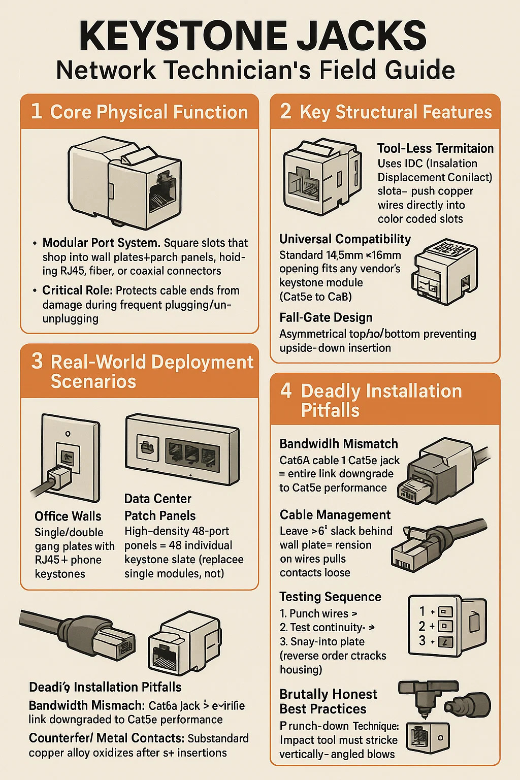 Modular Port System: Square slots that snap into wall plates/patch panels, holding RJ45, fiber, or coaxial connectors. Converts in-wall cables to user-accessible ports.
